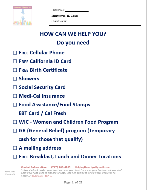 Helping HandUps will work with government agencies to secure state ID and social security cards, birth certificates, set up email addresses if our client doesn't have one, provide a cell phone to facilitate treatment, and a mailing address for document delivery.